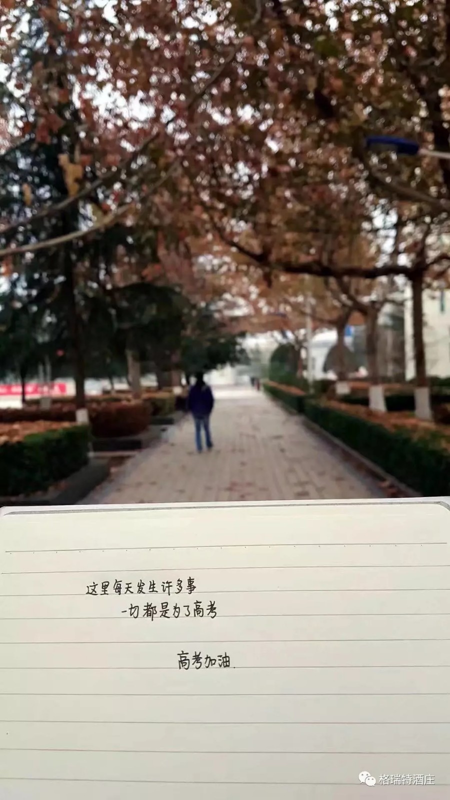 前日下了一場雨,這場雨訴說了太多太多不平凡的故事。當你們昂首闊步,胸有成竹的走向考場時,一定會想起無論風吹雨打依然每天穿梭在從家到學校那條最繁忙的街道上,會想起每天總沿著校園的教室、食堂、宿舍、廁所的四點一線的枯燥生活,也會想起左手拿飯菜右手持披荊斬棘的劍,奮筆疾書的樣子,更不會忘記每天凌晨的教室依舊燈火通明,你們一直陪伴著星空,很久很久的一個個夜晚。