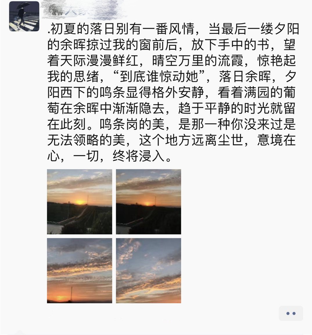 夏日的晚霞別有一番風(fēng)情,當(dāng)最后一縷夕陽的余暉掠過窗前,放下手中的書,望著天際漫漫鮮紅,晴空萬里的流霞,驚艷起我的思緒,“到底誰驚動了她”,落日余暉,夕陽西下的鳴條顯得格外安靜,看著滿園的葡萄在晚霞中漸漸隱去,趨于平靜的時光就留在此刻。鳴條崗的美,是那一種你沒來過是無法領(lǐng)略的美,這個地方遠(yuǎn)離塵世,意境在心,一切,終將浸入。