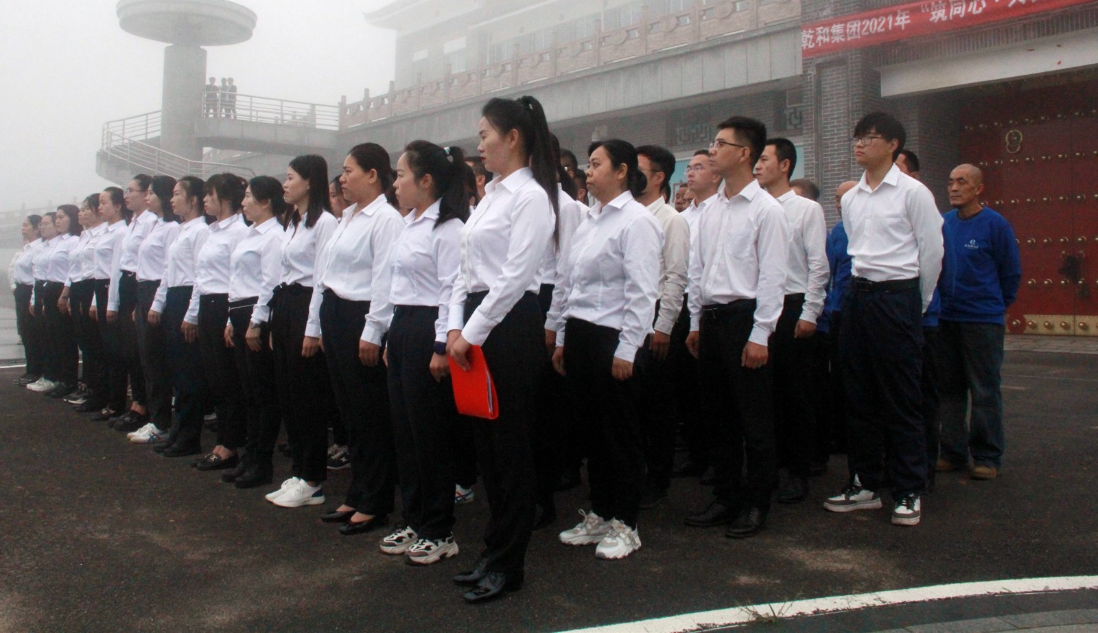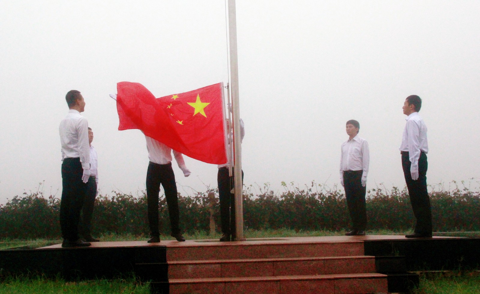 全體員工統(tǒng)一著裝、整齊列隊(duì),面對國旗肅立,行注目禮,伴隨著雄壯激昂的《義勇軍進(jìn)行曲》,鮮艷的五星紅旗冉冉升起。