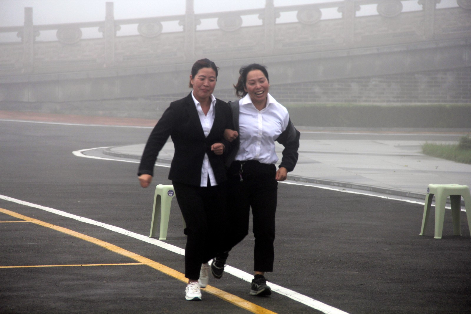 兩人三足游戲一聲令下,選手們兩人并駕齊驅(qū),配合默契,其中,有力求速度的組合:目光堅(jiān)定直奔終點(diǎn);也有穩(wěn)中求勝的搭檔:步伐穩(wěn)健,互相激勵。